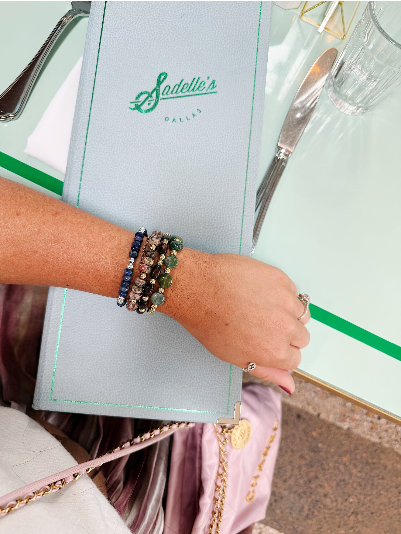 - Hand beaded on high performance 1 mm elastic for a slight stretch to easily roll on and off your wrist