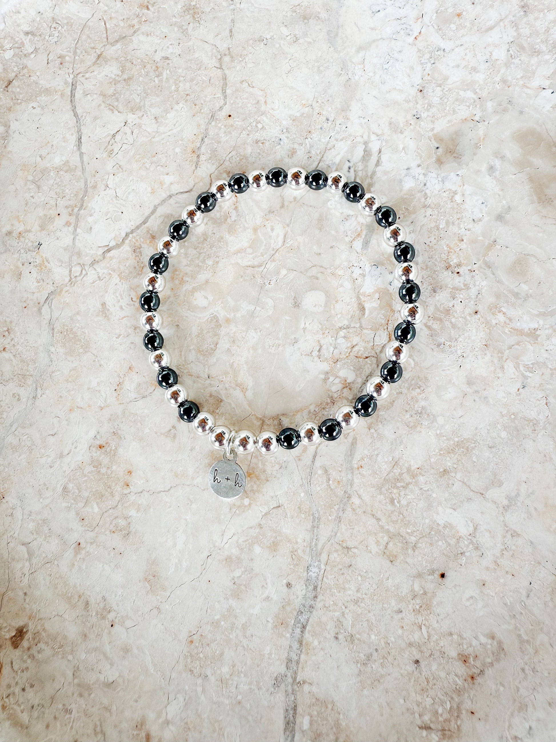 - 5 mm silver plated brass beads with a mix of grey hematite round beads