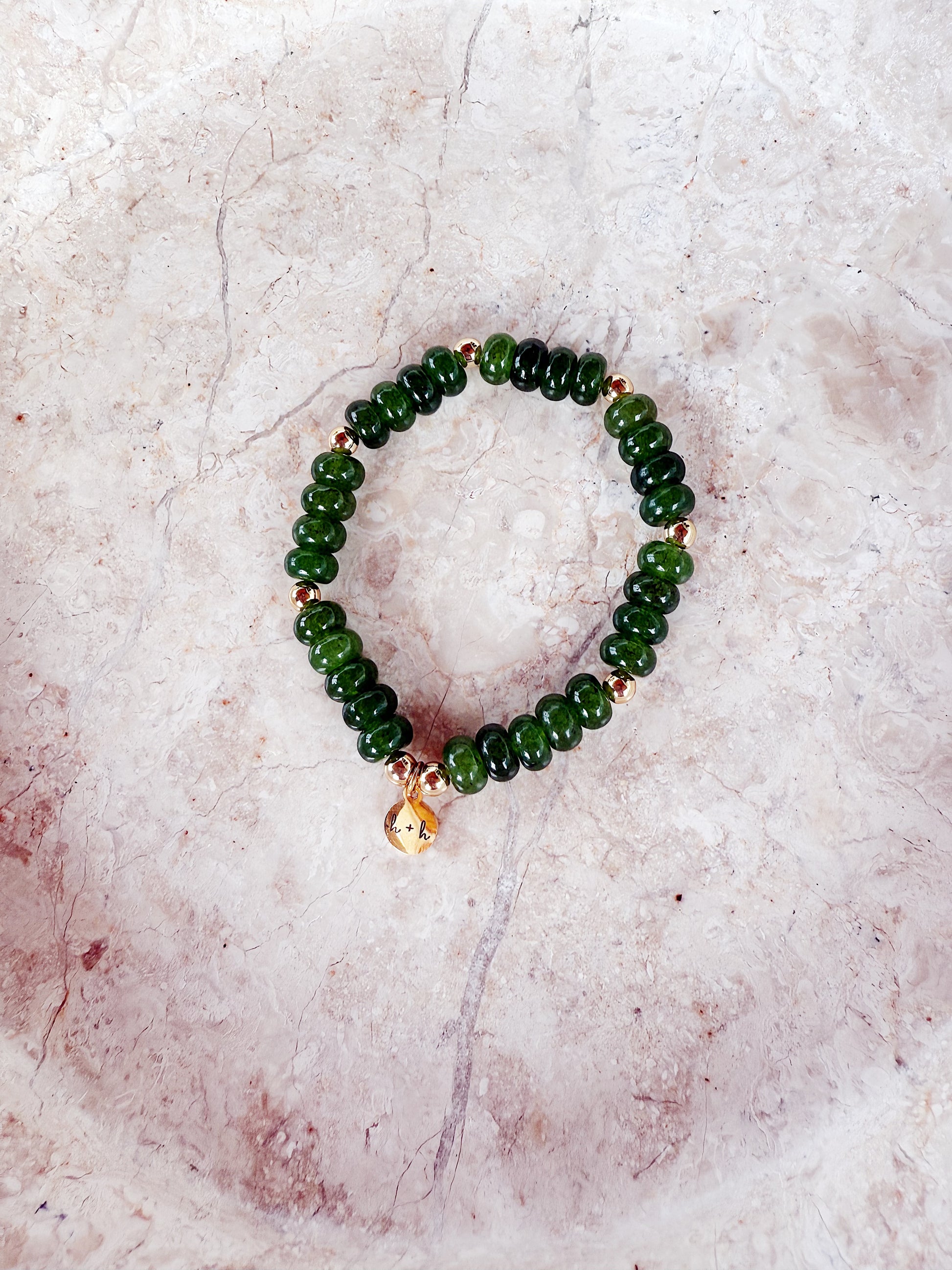 - 6 mm green rondelle glass beads + 14K gold filled beads